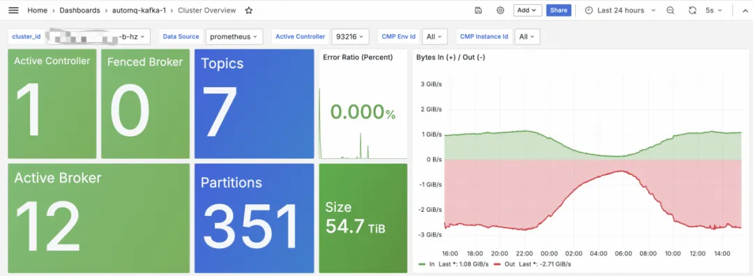 Besides substantial cost reduction, AutoMQ architecture played a pivotal role in this year's Double Eleven event, eliminating the necessity for extensive capacity assessment and early expansion operational costs. Since the inception of AutoMQ cluster, it has demonstrated high availability with zero downtime throughout the Double Eleven period, accommodating 100% of the traffic. It maintained stable load even during peak times without any performance volatility. The ensuing diagram illustrates one of the clusters in the AutoMQ setup of Poizon's observable platform, demonstrating GiB-level throughput.
