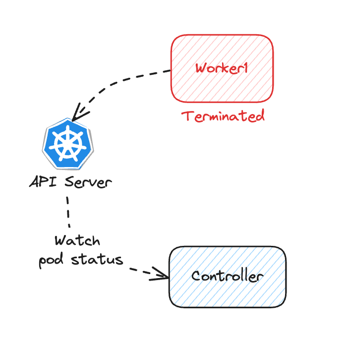 We conceptualize a collection of identically configured Workers as a Worker Deployment, aligning with the Deployment model in K8s. Each Worker functions as a Pod within this Deployment. Creating Workers through the Controller is comparable to deploying a Deployment to the API Server and awaiting the activation of all Pods, as illustrated in Steps 1 and 2. K8s nodes scale appropriately, provisioning the necessary Spot instance virtual machines.