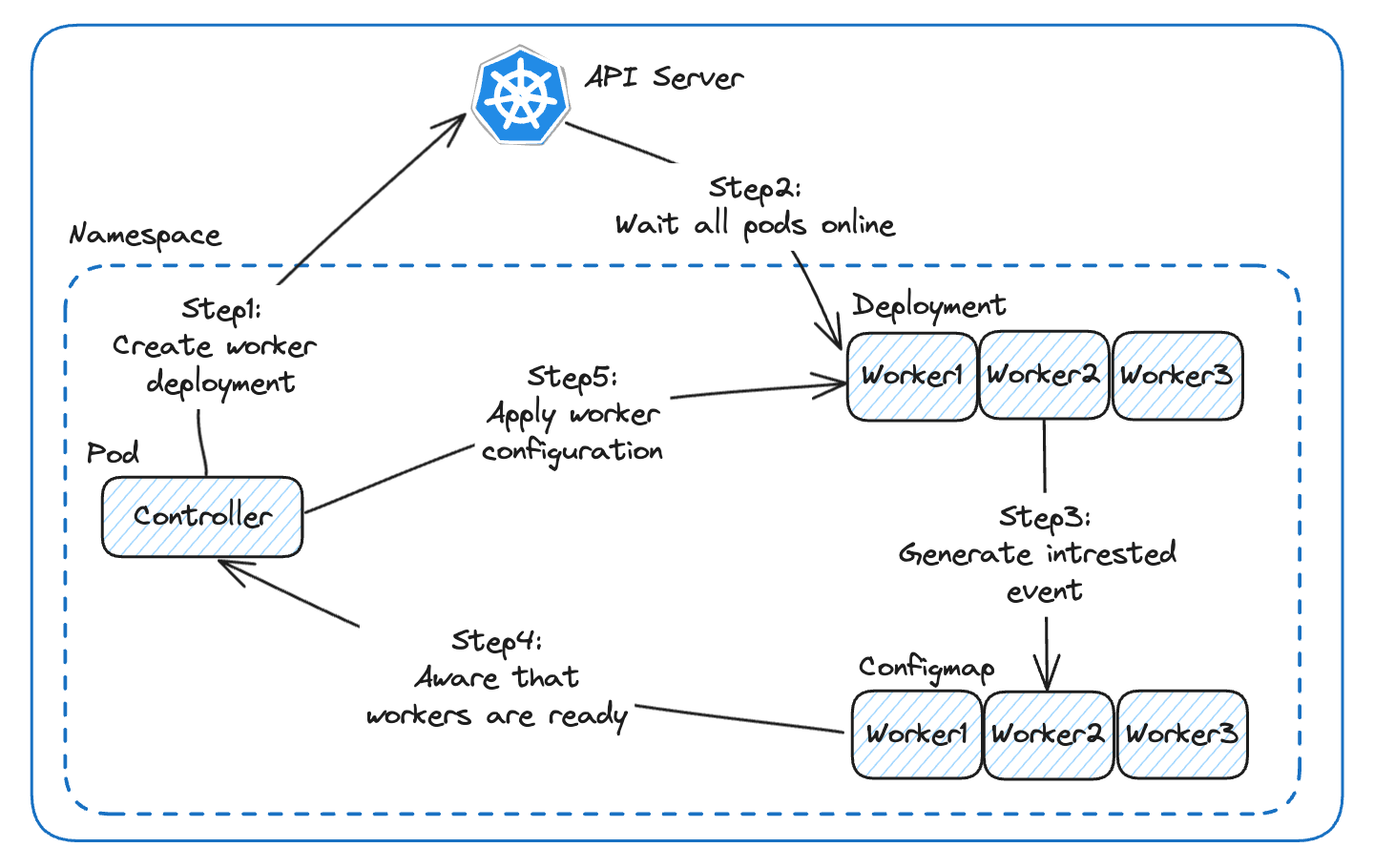 Upon initialization, each Worker generates a Configmap that catalogs the events of interest, initially concentrating on initialization events (Step 3). The Controller monitors for newly created Configmaps using the K8s Watch API (Step 4), subsequently dispatching initialization events containing configurations to these Workers (Step 5).
