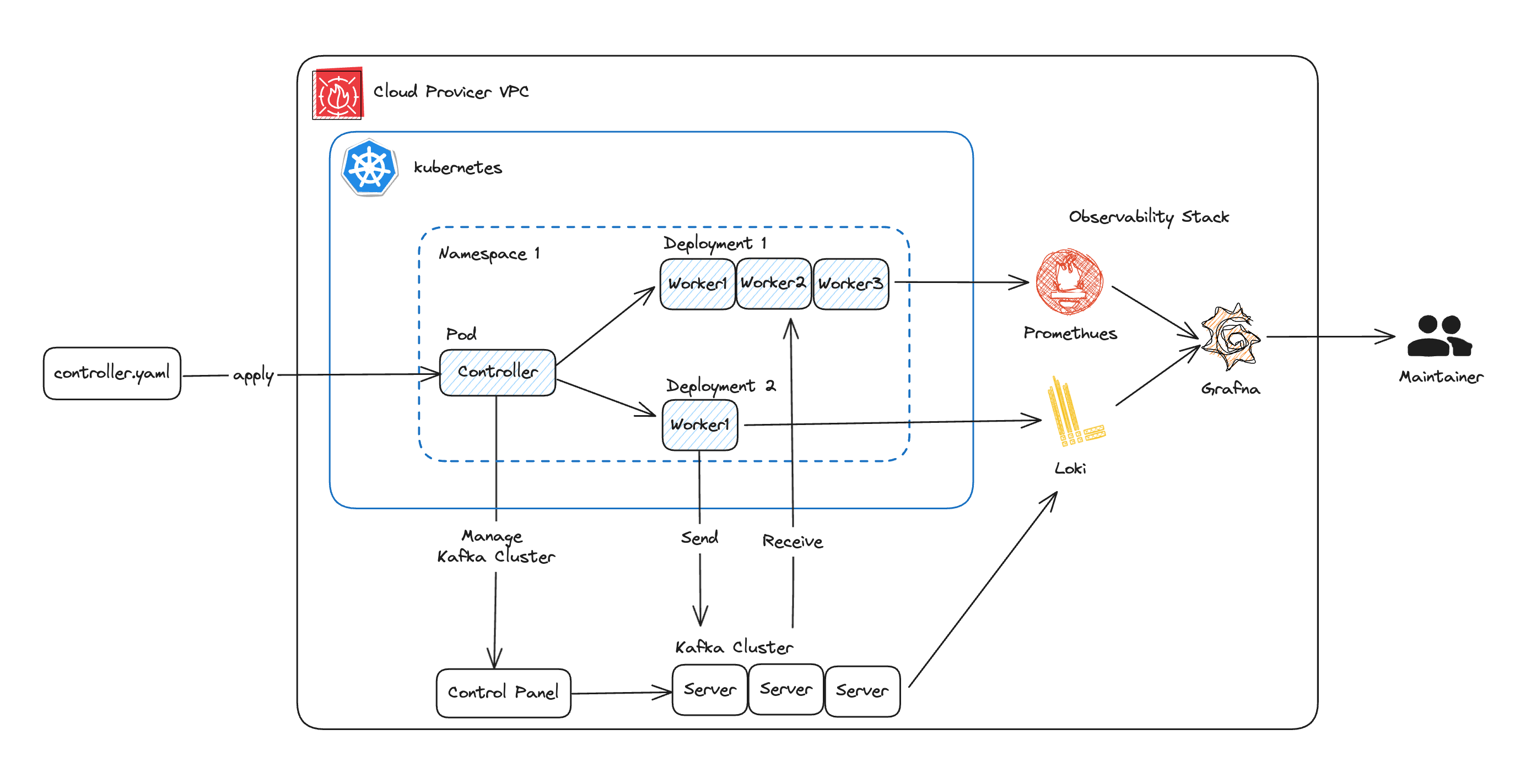 Worker: Operates Kafka clients to generate the necessary workload for tasks and is also tasked with reporting observability data and performing client-side SLA assessments