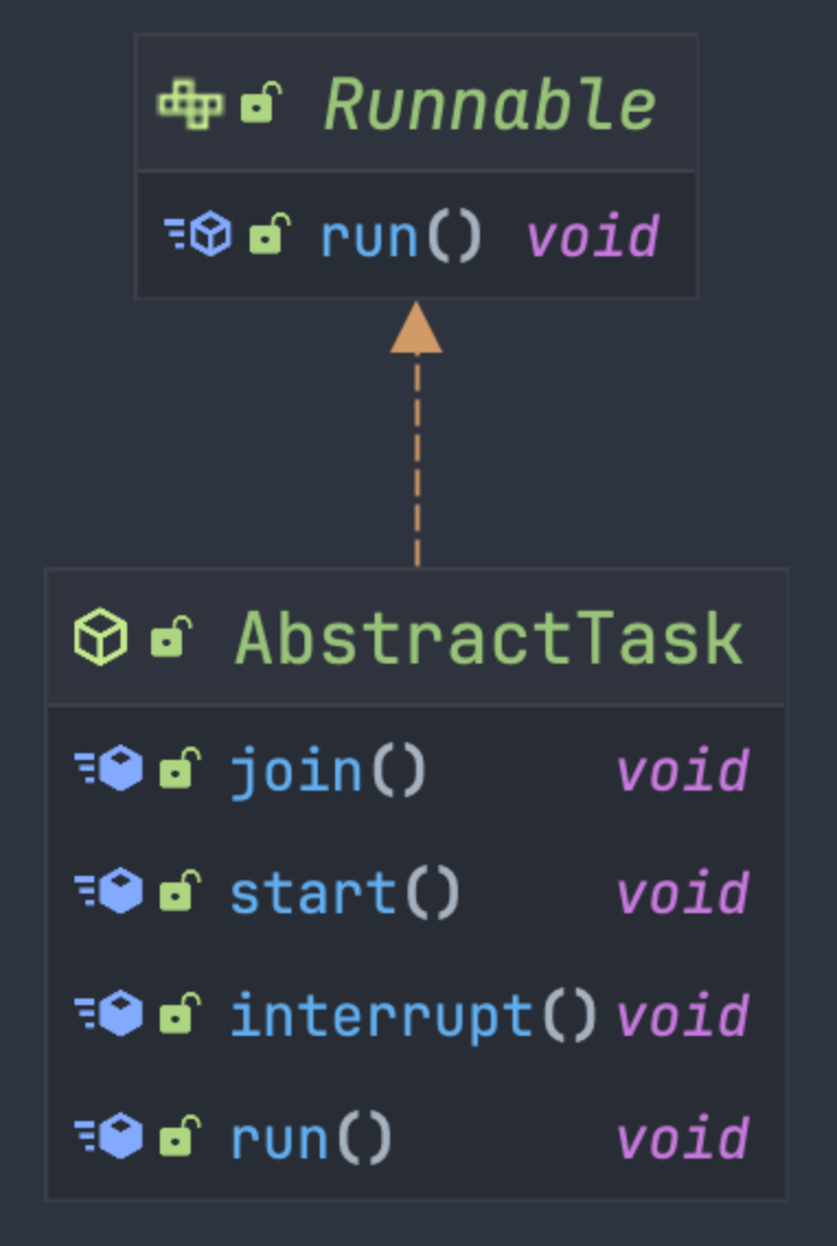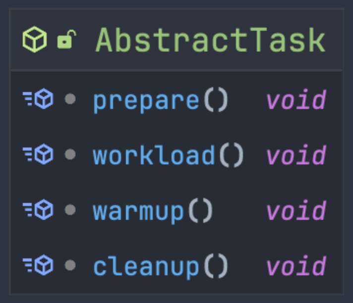 Exploring additional methods in AbstractTask reveals its inheritance from the Runnable interface. By overriding the run method, it sequentially executes the lifecycle stages: prepare, warmup, workload, and cleanup, enabling the Task to be assigned to a thread for execution.