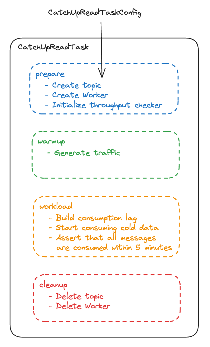 The Workload stage is the key differentiator among various task scenarios, where the CatchUpReadTask needs to build an appropriate backlog volume and then ensure it can be consumed within 5 minutes. For ChaosTask, the approach shifts to terminating a node and verifying that its partitions can be reassigned to other nodes within 1 minute. To cater to the diverse requirements of these tasks, the Marathon framework offers a toolkit for crafting test scenarios, as illustrated in the figure above: