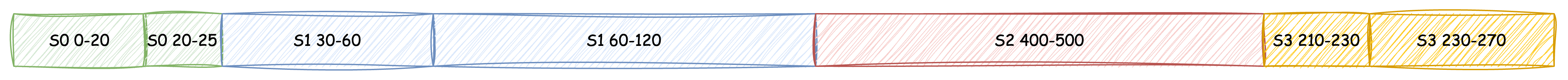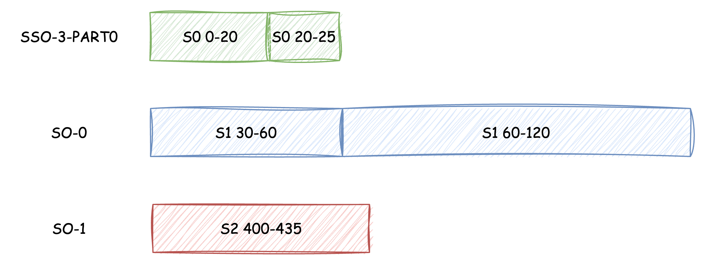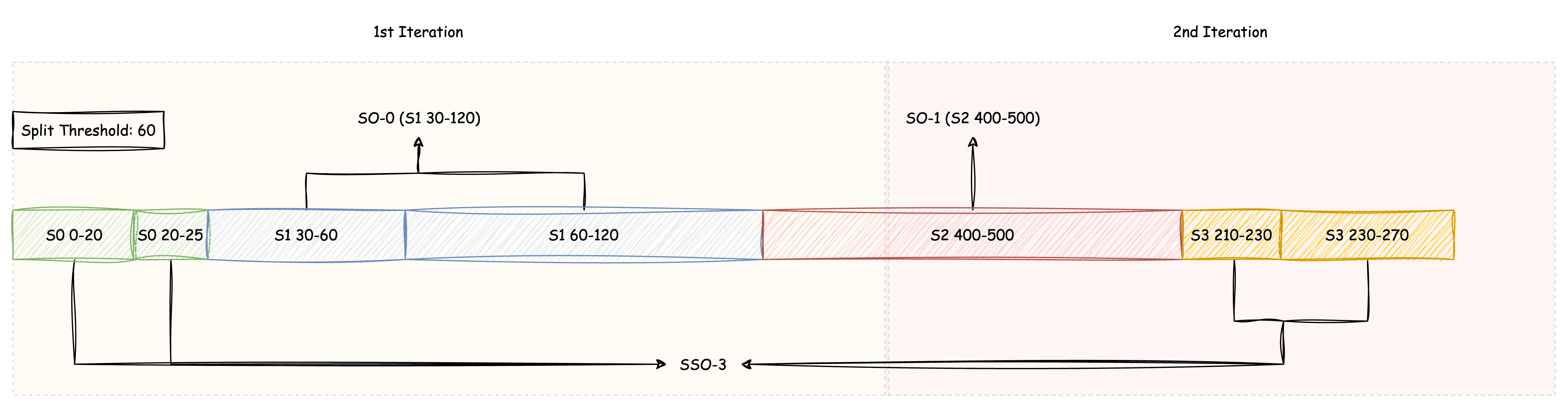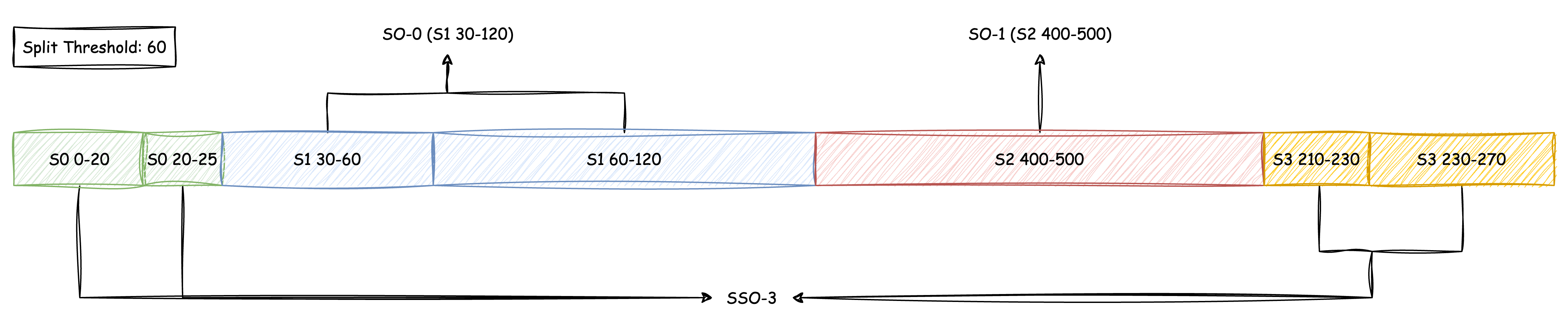 Once sorted, consecutive data segments of the same Stream that exceed the split threshold will be split into individual SOs, and the remaining data segments will form new SSOs: