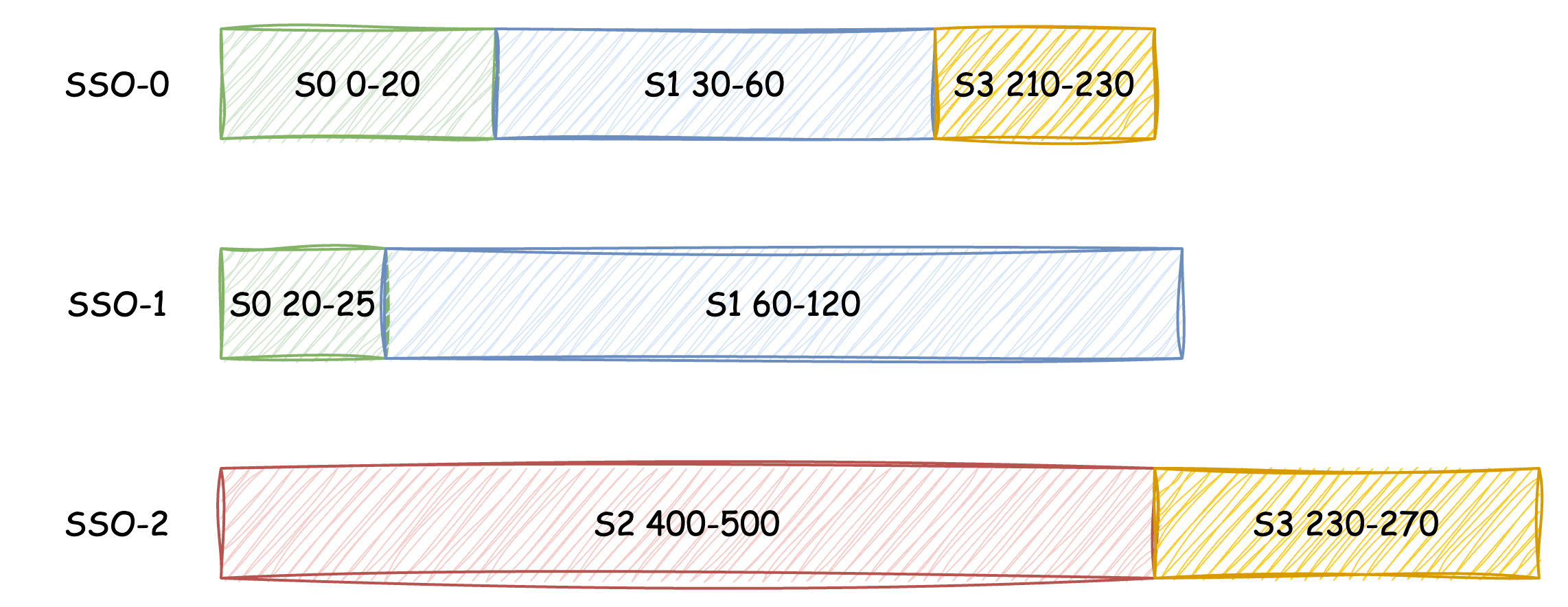 At the beginning of SSO Compaction, all SSOs generated by the current node are retrieved, and the index files of each SSO are read to parse the Streams and corresponding data ranges within each object. During this process, expired data segments of each Stream are directly ignored. The compaction process of the three SSOs shown in the figure below will be taken as an example (note that the length of the color blocks in the figure only indicates the length of the corresponding data segments; the actual data segments are not read at this step):
