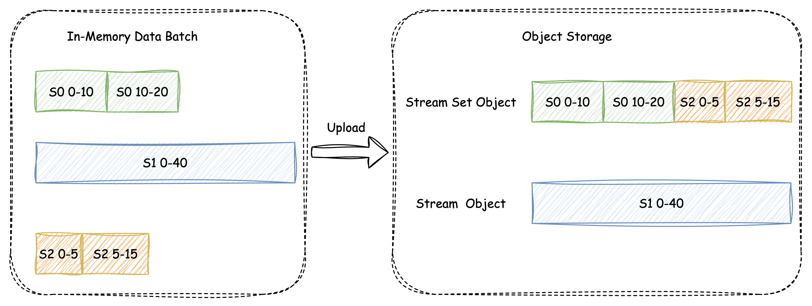 When transmitting data, if it exceeds a predefined length threshold from the same stream, it directly uploads as a Single Object (SO). The residual data from various partitions is consolidated into one Single Stream Object (SSO), arranged in ascending order of stream ID, as illustrated in the subsequent diagram: