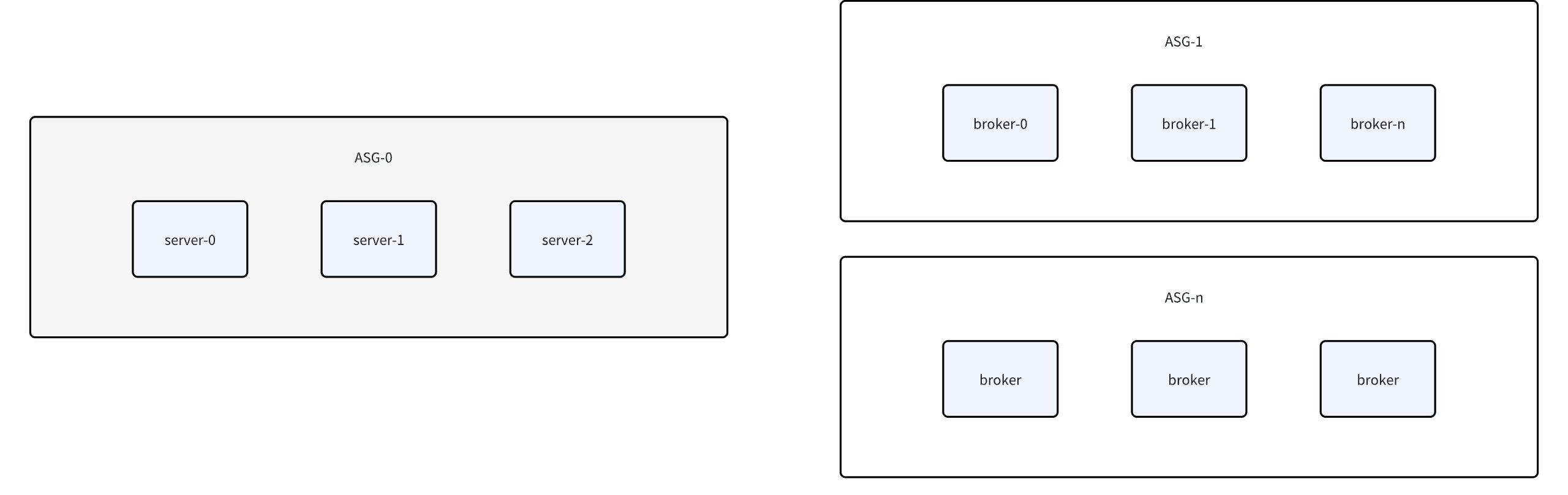 When using elastic scaling groups, we differentiate between Kafka controllers and broker nodes by placing them in different scaling groups. Here, we introduce a concept: nodes that serve both controller and broker functions are called server nodes. As the cluster scales, we further segment pure broker nodes into different elastic scaling groups based on their characteristics.