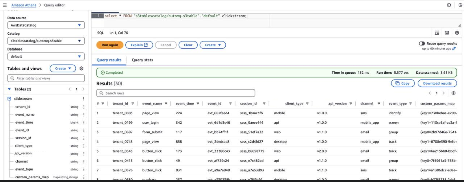 AutoMQ Table Topic will automatically create tables in your AWS S3 table bucket. To query this data, open AWS Athena in the AWS Management Console. Use Athena to query the Clickstream data stored in the tables created by AutoMQ.