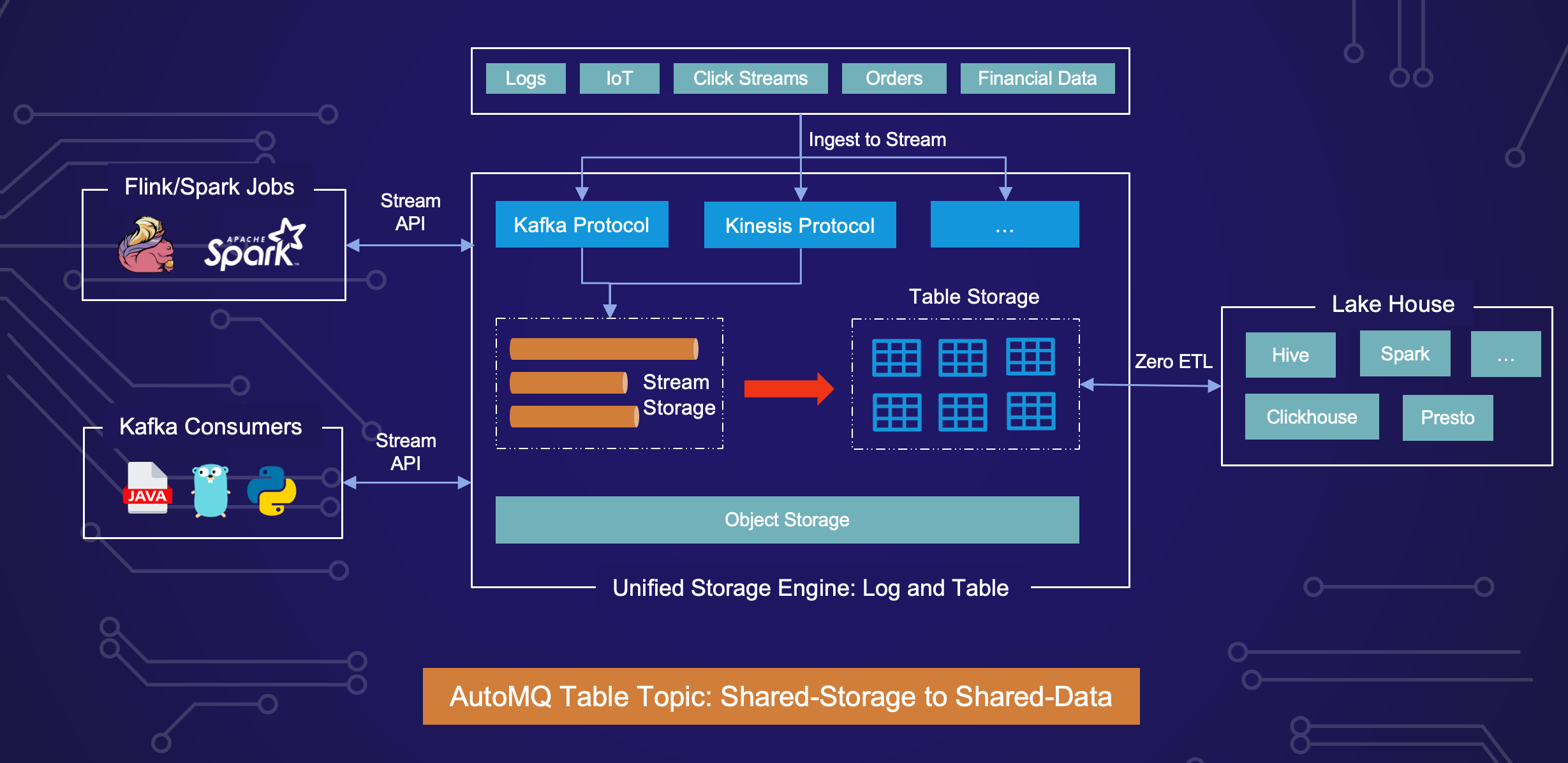 AutoMQ exemplifies the shared-data architecture with its Table Topic feature, which natively supports Apache Iceberg. This integration allows stream data to be ingested directly into the data lake and transformed into structured, queryable tables in real time. The Table Topic feature bridges the gap between batch and stream processing, enabling enterprises to analyze and act on data as it is generated.