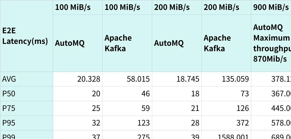 Real-time Read/Write: With the same cluster size, AutoMQ's maximum read/write throughput is three times that of Apache Kafka, and the E2E latency is 1/13 of Apache Kafka.