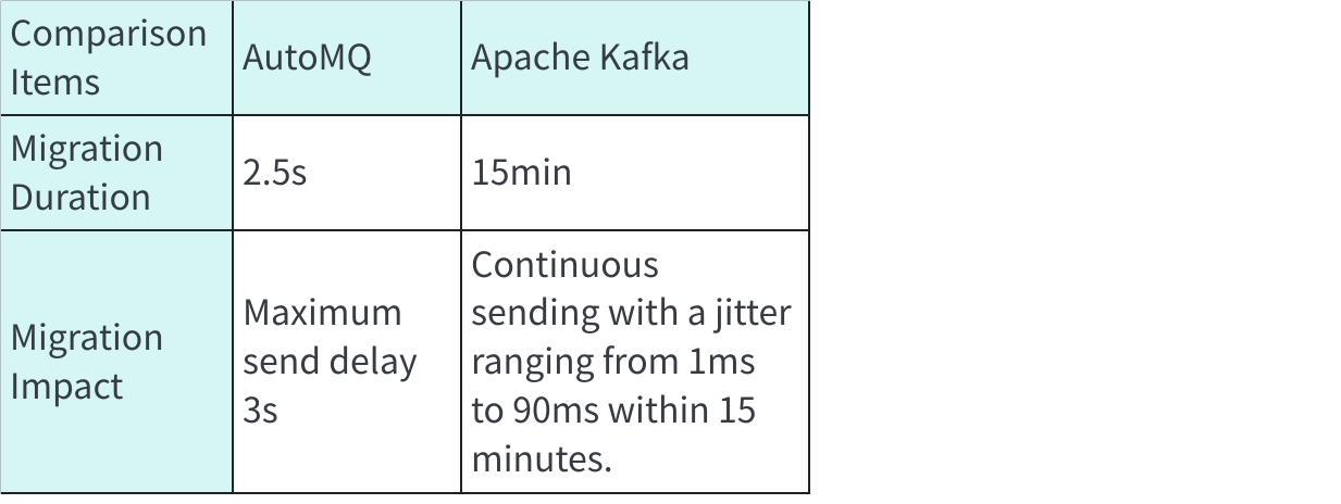 AutoMQ partition migration only requires uploading the buffered data from EBS to S3 to safely open it on the new node. Typically, 500 MiB of data can be uploaded within 2 to 5 seconds. The time taken for AutoMQ partition migration is not dependent on the data volume of the partition. The average migration time is around 2 seconds. During the migration process, AutoMQ returns the NOT_LEADER_OR_FOLLOWER error code to clients. After the migration is complete, the client updates to the new Topic routing table and internally retries sending to the new node. As a result, the send latency for that partition will increase temporarily and will return to normal levels after the migration is complete.
