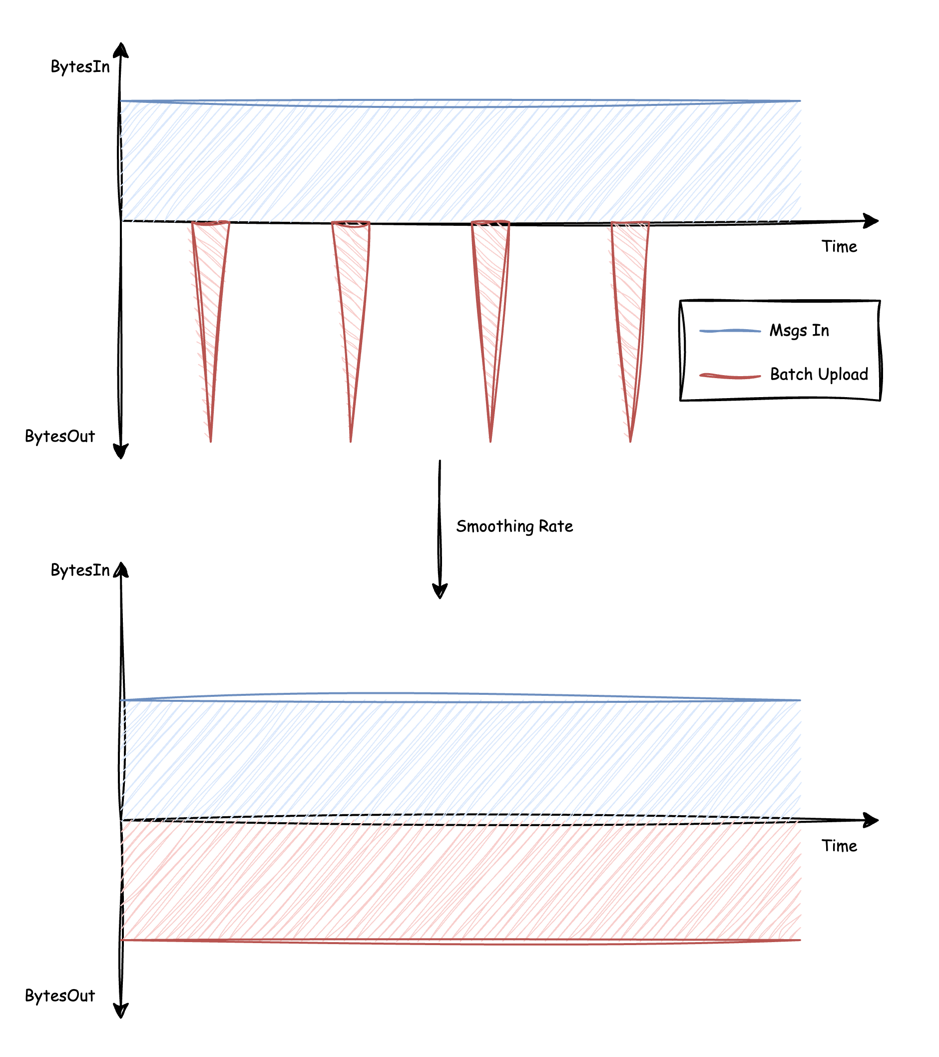 When messages are batched in memory and ready, they are triggered to upload to S3. Given that the default batch size is generally several hundred MB, each upload results in writing several hundred MB of data into the network at one time, causing significant network spikes. Under limited machine bandwidth conditions, this could lead to latency spikes in the regular message processing workflow, affecting business stability. Ideally, the upload rate should match the send rate to achieve smooth upload traffic.