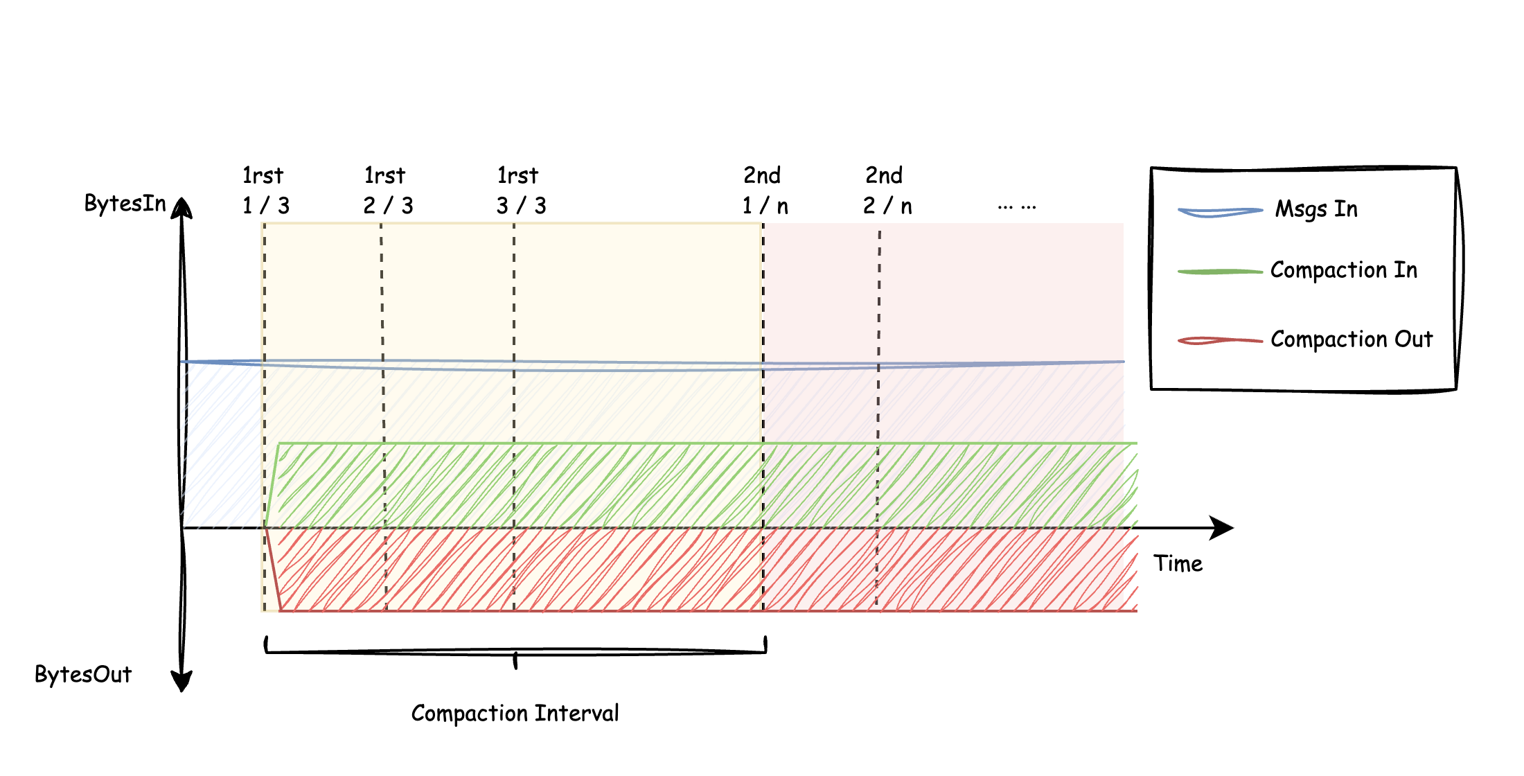 At the beginning of each iteration of every Compaction round, a centralized trigger initiates a read operation to load the data that needs to be compacted to the local storage. After the data is merged locally, it is uploaded as a new S3 Object. By applying smooth rate limiting to Compaction, the read and upload traffic of Compaction is distributed over the entire Compaction cycle. This results in stable "background traffic" within the system, thereby minimizing any spiky impact on the system: