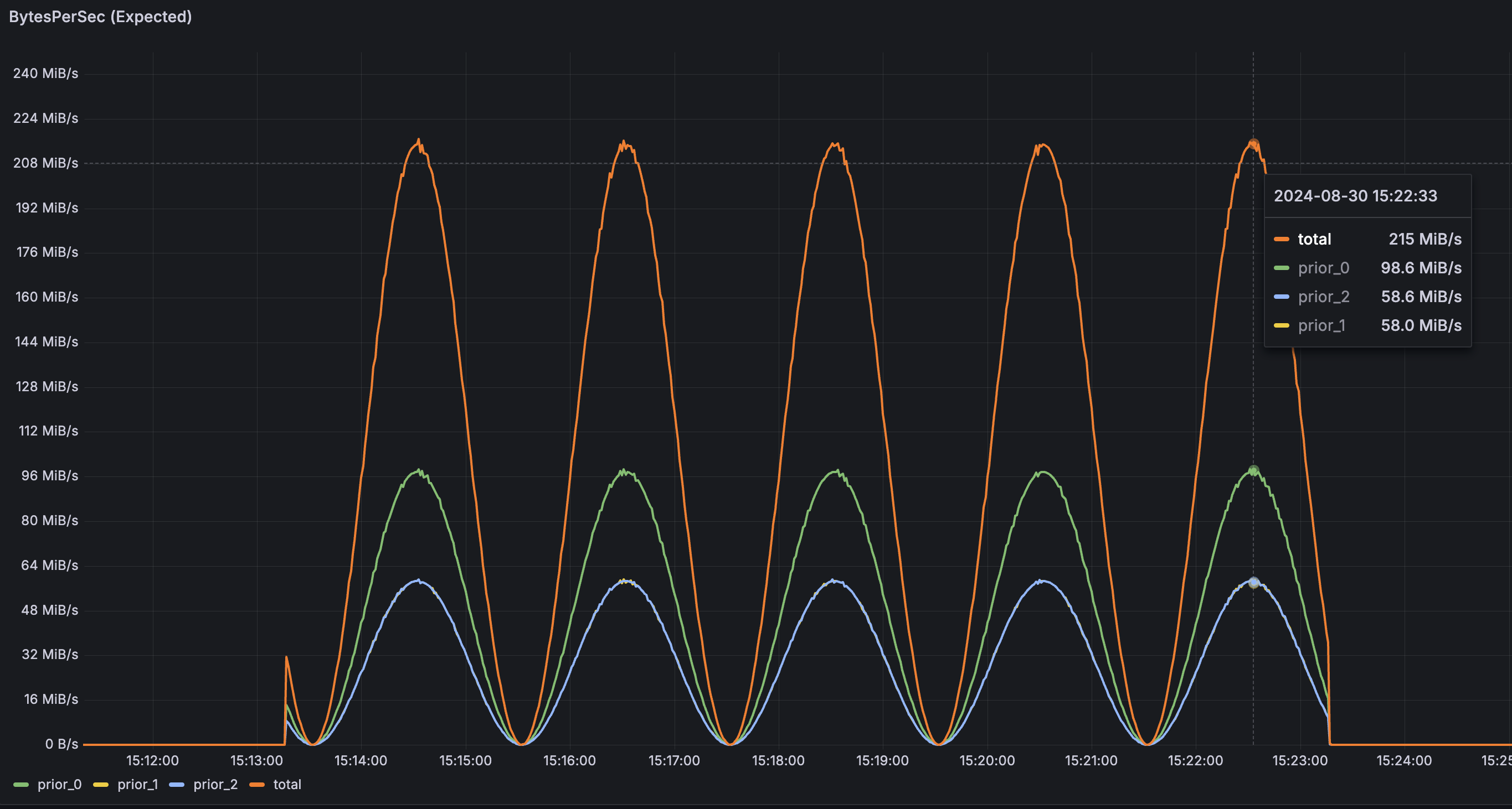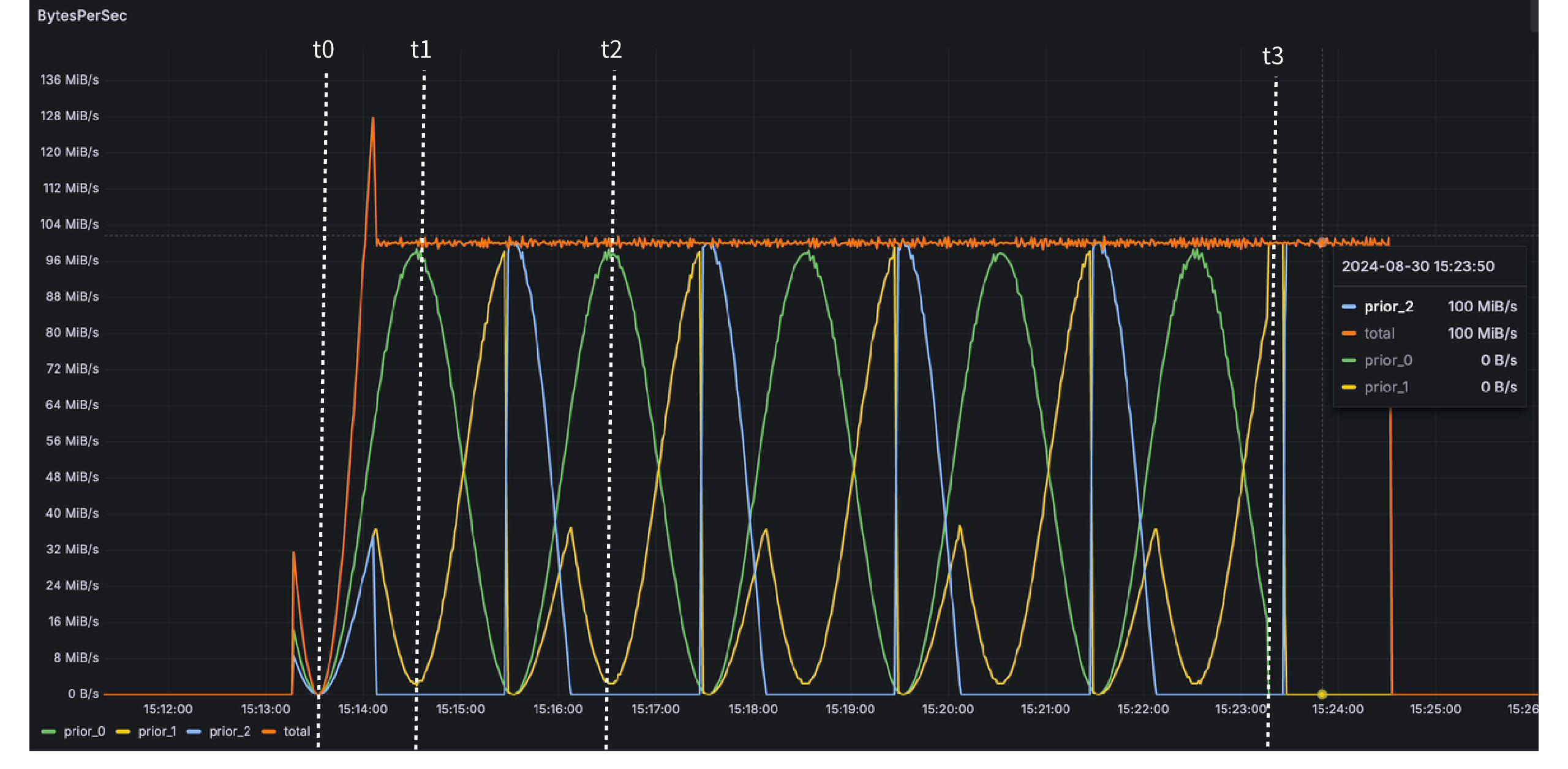 t3 ~ end: As Tier-0 traffic ceases, Tier-1 and Tier-2 queued traffic is sequentially released until the pressure traffic depletes, all while maintaining a maximum traffic limit of 100MB/s throughout.