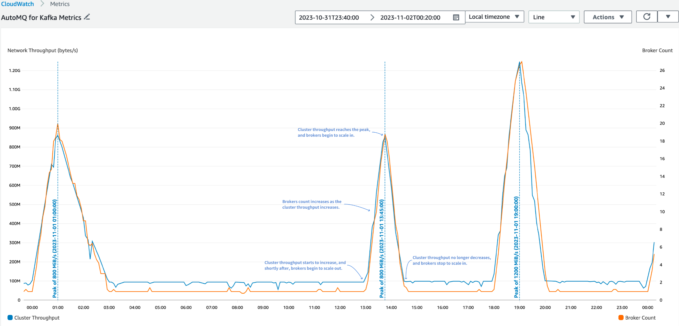 active instance count in ASG (acount): Number of active instances in an ASG, with AWS typically aggregating metrics for the group, necessitating a division by the number of broker machines in the ASG to calculate the traffic per broker.
