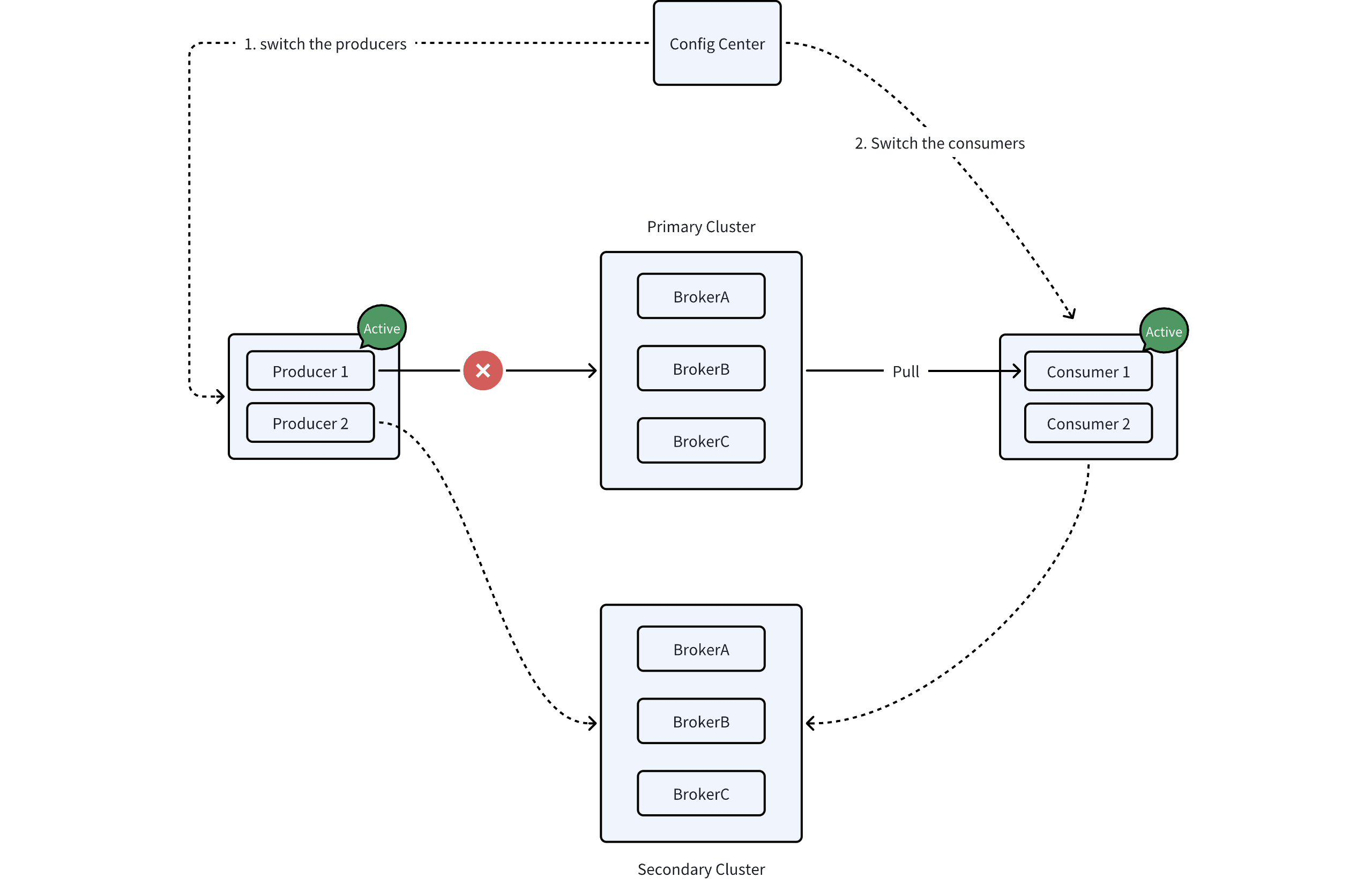 If you don't care about the order, you can optionally write the data to two clusters, and consumers will eventually fetch all the data. However, if order matters, you can't write data to both clusters simultaneously. Instead, you should follow a primary-secondary architecture and carefully switch the traffic.