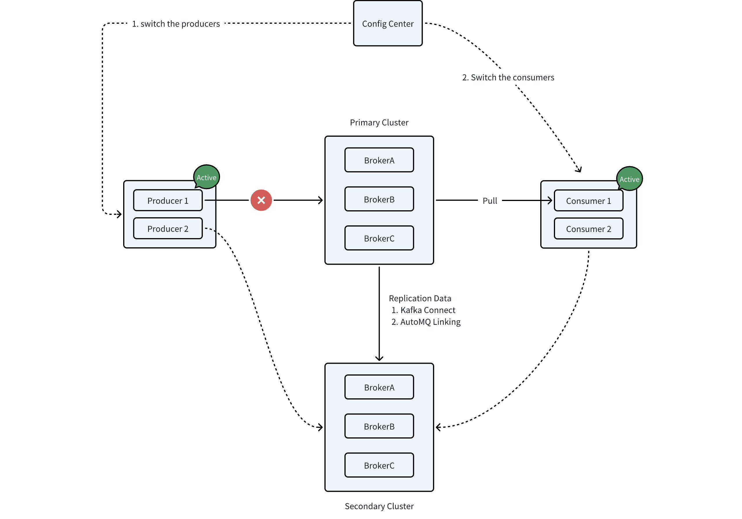 If you opt for failover support between two Kafka clusters, AutoMQ is your best choice. It is highly scalable, allowing you to maintain a small, cost-effective standby AutoMQ cluster for recovery. In the event your primary cluster goes down, you can quickly scale out your secondary AutoMQ cluster within a minute to handle your traffic seamlessly.