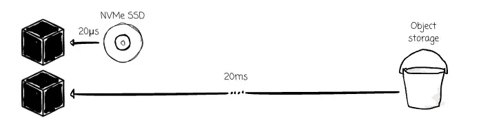 The first and most obvious challenge is the latency. Here are some numbers to help you imagine: with GetObject requests to object storage, the median latency is ~15ms, and P90 is ~60ms. The latency of an NVMe SSD is 20–100 μs, which is 1000x faster.