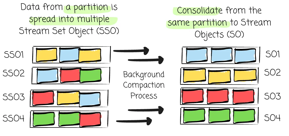 Stream Set Object (SSO): An object that contains consecutive data segments from different partitions