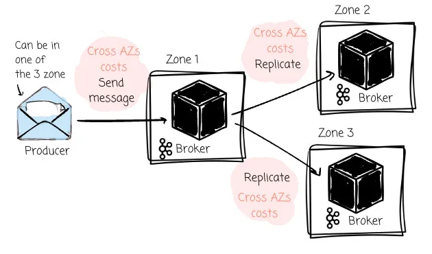 Another problem is cross-Availability Zone (AZ) transfer fees. Cloud vendors like AWS or GCP charge fees when we issue requests to different zones. Because producers can only produce messages to the partition leader, when deploying Kafka on the cloud, the producers must write to a leader in a different zone approximately two-thirds of the time (given a setup with three brokers). Kafka setup on the cloud can also incur significant cross-Availability Zone (AZ) transfer fees because the leader must replicate messages to followers in other zones.