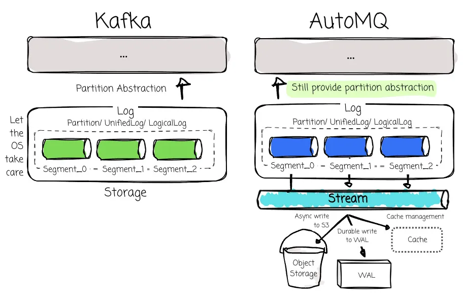 To ensure Kafka’s 100% Compatibility, AutoMQ reuses all the logic except for the storage layer. For the new implementation, AutoMQ has to ensure that it still provides the partition abstraction so other Kafka modules like ReplicaManager, Coordinator, or Kraft can smoothly integrate.