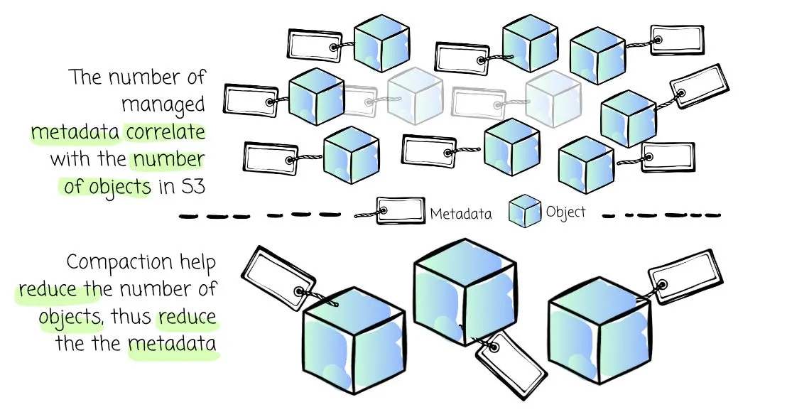 These metadata numbers correlate with the total number of objects stored in S3. To keep the number of metadata optimal, AutoMQ leverages the compaction technique from the IOPS section to combine multiple small objects into larger ones, thus limiting the amount of metadata.