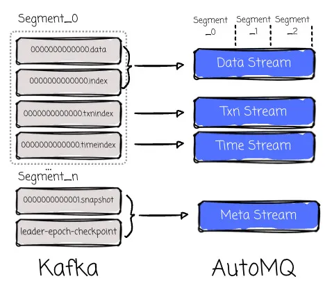 Compared to Kafka’s Log, it lacks indexing, transaction index, timestamp index, and compaction. To align with how Kafka organizes metadata and index, AutoMQ’s stream contains: