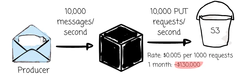 Related to the latency is the frequency of data writing to object storage. S3 Standard PUT requests are $0.005 per 1000 requests. A service with 10,000 writes per second would cost $130,000 per month.