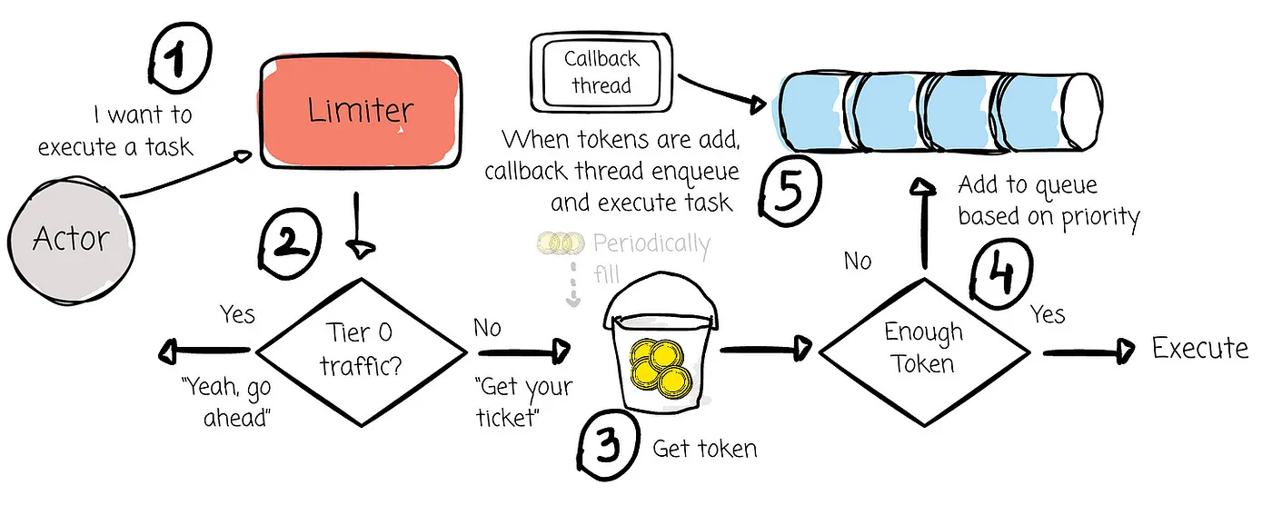 AutoMQ implements an asynchronous multi-tier rate limiter based on the priority queue and the token bucket.