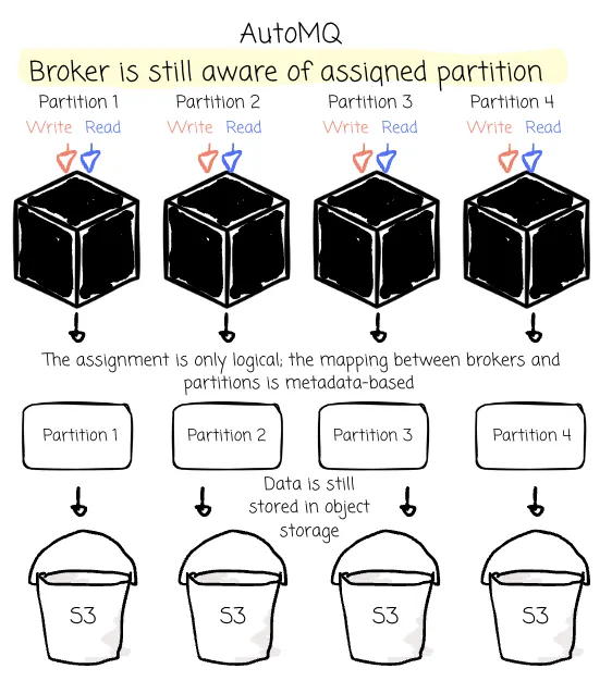 Although AutoMQ is designed to store data completely in object storage, it still wants the brokers to know which partition they are responsible for. AutoMQ intends to keep the “data locality” characteristic, just like Kafka, where AutoMQ still assigns partition-specific brokers.