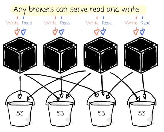 Both shared nothing and shared disk have advantages. The first has data locality that can serve writes and cache data more efficiently. The latter storage provides the efficiency of sharing data across different nodes. Theoretically, any broker can read and write any partitions when storing data in object storage.