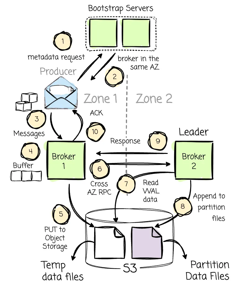 Solutions like WarpStream and Bufstream tried to hack the Kafka service discovery protocol. Before the producer can send messages in Kafka, it must acquire the partition’s leader information by issuing a metadata request to a set of bootstrap servers. WarpStream or Bufstream will try to respond to metadata requests with the broker having the same availability zone as the producer, because to them, any brokers can serve message writing; there is no concept of “leader” here.