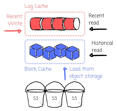 If data isn’t available in the log cache, it will be read from the block cache instead. The block cache is filled by loading data from object storage. It improves the chances of hitting memory even for historical reads using techniques like prefetching and batch reading, which helps maintain performance during cold read operations.