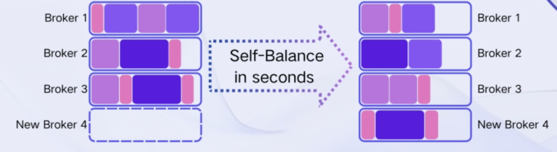 Continuous Traffic Self-Balancing : Apache Kafka® provides a partition reassignment tool, but the actual reassignment plan must be determined by the operations team. For Kafka clusters with hundreds or thousands of nodes, manually monitoring the cluster state and devising a comprehensive partition reassignment plan is almost an impossible task. To address this, third-party external plugins such as Cruise Control for Apache Kafka[16] are available to assist in generating reassignment plans. However, due to the multitude of variables involved in Apache Kafka's self-balancing process (e.g., replica distribution, leader traffic distribution, node resource utilization, etc.) and the resource contention and time consumption (hours to days) due to data synchronization during rebalancing, existing solutions are highly complex and have low decision-making timeliness. Consequently, implementing self-balancing strategies still requires operations personnel's review and continuous monitoring, failing to solve the issue of uneven traffic distribution in Apache Kafka effectively. AutoMQ, on the other hand, integrates an automatic self-balancing component that, based on collected metric information, can automatically help users generate and execute partition reassignment plans, ensuring that cluster traffic is automatically rebalanced after elastic scaling.