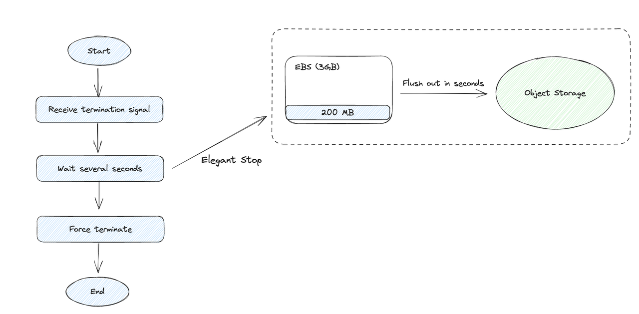 The general process of Spot instance recovery follows the following process: first send a termination signal, then wait for a few seconds before forcibly terminating the machine. The termination process of Spot instances from different cloud manufacturers is basically a variant of the following process, with the core path basically the same. The architecture of AutoMQ Kafka uses a very small (default 3GB) cloud disk SSD (EBS on AWS, hereafter referred to as EBS to represent cloud disk SSD) to act as a buffer, ensuring low latency for AutoMQ Kafka's tail reads. Thanks to AutoMQ Kafka's stateless Broker design, only a few hundred MB of cache data will remain on EBS. As long as these data are flushed to object storage during the waiting period after the Spot instance receives the termination signal, a graceful shutdown can be completed.