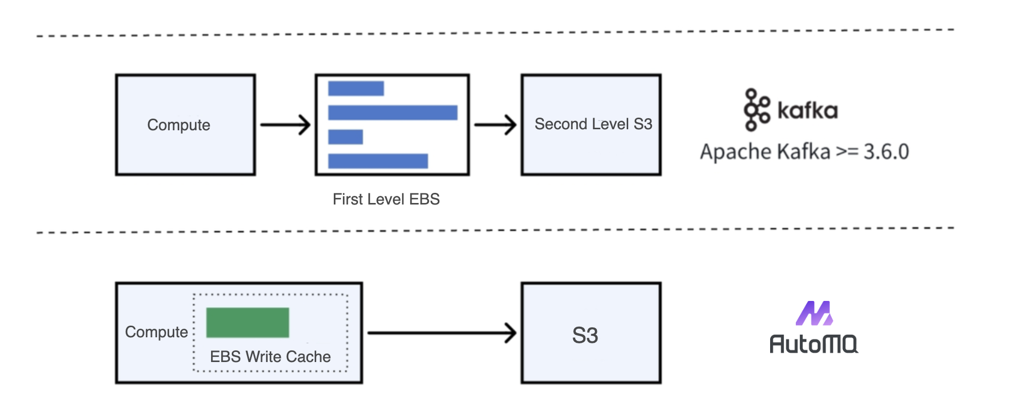 Although AutoMQ Kafka relies on EBS block storage in addition to object storage in its architecture, it essentially uses a stateless architecture. Primary storage is loosely coupled and acts as a buffer. The following diagram reveals the difference between Apache Kafka's multi-tier storage and AutoMQ's storage architecture. The EBS write buffer used by AutoMQ Kafka defaults to a fixed 3GB, which can be downsized to the second or even millisecond level in scaling scenarios (depending on the specific model used).