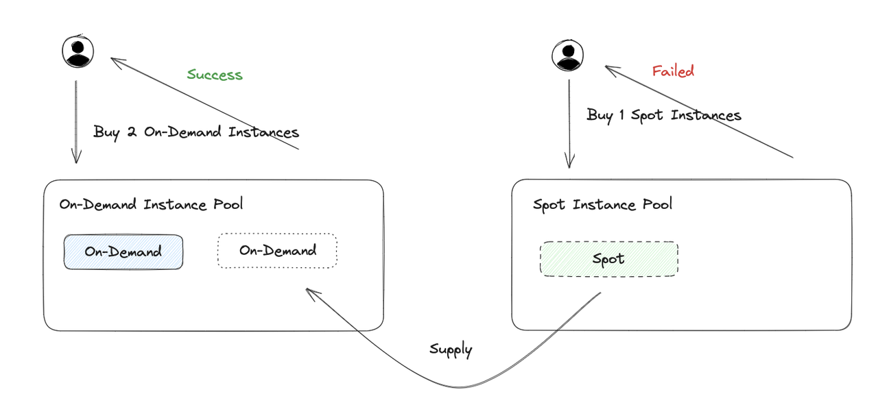 In addition to the problem of being interruptible, Spot instances also have the problem of being prone to inventory shortages. For cloud manufacturers, on-demand instances have SLAs and need to be prioritized to ensure sufficient inventory. If a region or availability zone is short of computing instance inventory, it will be prioritized to meet the supply of on-demand instances. Under this rule, the Spot instance inventory capacity in some unpopular regions or availability zones is prone to shortages, and there may be situations where Spot instances cannot be purchased when instance replacement is needed.