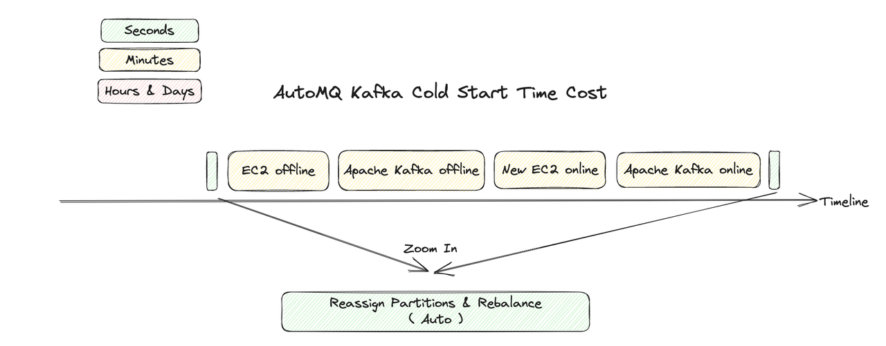 Taking Apache Kafka as an example, if Spot instances are used and instance replacement occurs, the entire cold start process is as follows. From the diagram, we can clearly see that when the data scale is large (TB level) or there are partition hotspots, the process of manually completing partition migration, data copying, and traffic rebalancing in Apache Kafka's entire cold start time is very time-consuming, reaching hours or even days, while AutoMQ Kafka, due to its reliability and availability separation design, high reliability with a single replica, and no data copying in the entire partition movement process. The following diagram clearly shows that if Apache Kafka is used in scenarios with a large data scale, it is completely impossible to use Spot instances and provide serverless capabilities, because on the entire timeline of cold start, Apache Kafka's time consumption in partition movement and traffic rebalancing occupies an absolute proportion of the total time consumption. Without reducing these two time consumptions to the same order of magnitude as other cold start stages, the application of spot instances and serverless is out of the question.