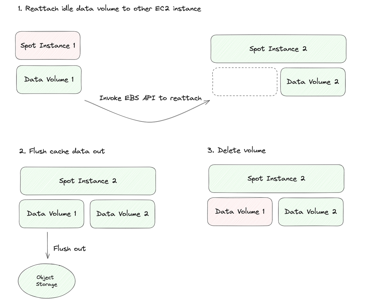 - Flush the small amount of data remaining on the orphaned data volume to object storage.
