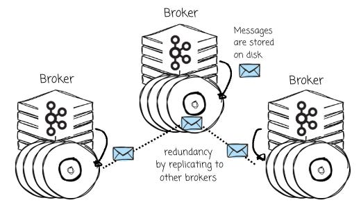 Adhering to these facts, Kafka’s brokers were designed to store messages directly on the local disk, and data redundancy and availability are achieved through message replication between brokers.