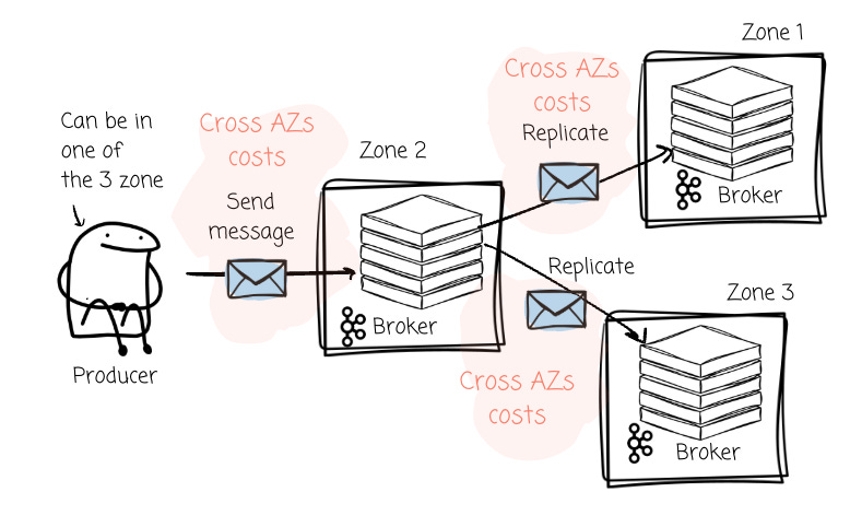 - Producer Traffic Costs: In a typical high-availability setup with brokers spread across three AZs, producers must send their messages to the leader broker for a given partition. If a Kafka cluster spans the leader partitions across three zones, producers will send messages to brokers that are located in different zones approximately two-thirds of the time.