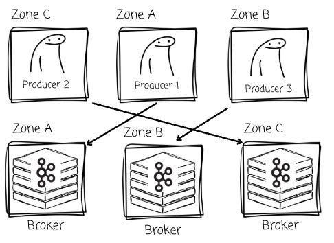 If the leader is in a different zone: when the producer asks for the broker information to send messages; instead of returning the info of the leader (which is located in a different zone), the discovery service will return the broker that is in the same zone as the producer.