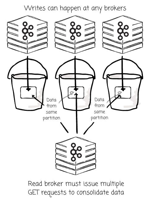 Conversely, leaderless architectures might suffer from low data locality . When any broker can write data for a partition at any time, the data for that single partition becomes fragmented across many small objects in S3, created by different brokers.