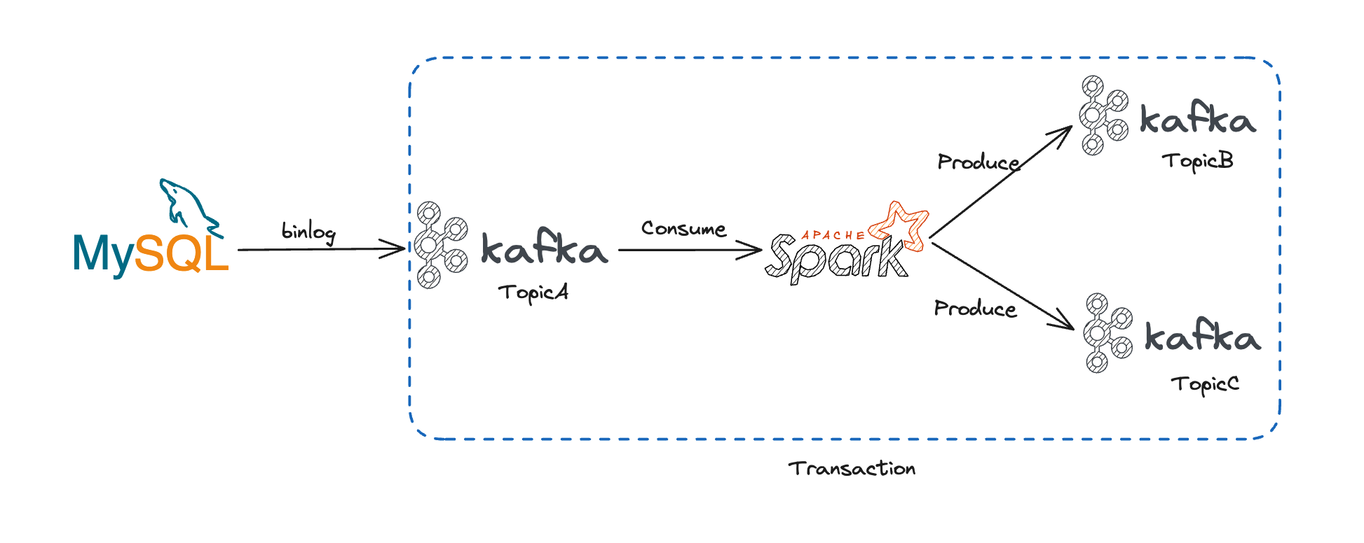 MySQL's binlog, as an upstream data source, writes data into Kafka. Spark Streaming reads data from Kafka and processes it, eventually writing the results into two other Topics (all three Topics are within the same cluster). The operations of consuming Topic A and writing to Topics B and C are transactional.
