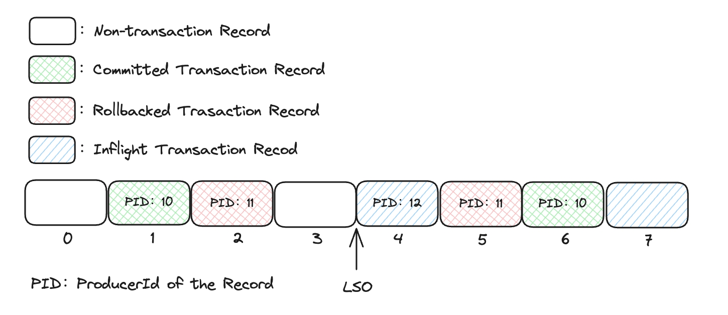 However, it's notable that there are messages that have been rolled back prior to the LSO (as indicated by the red rectangle in the diagram), which ought to be excluded: when a Broker processes an `ApiKeys.WRITE_TXN_MARKERS` request, it logs the indices of these rolled-back messages into the `.txnindex` file (`LogSegmentKafka#updateTxnIndex`).