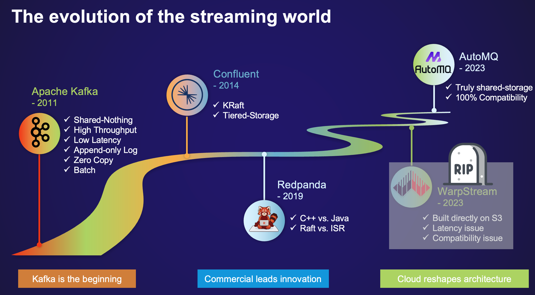 In August 2023, WarpStream debuted with the blog post "Kafka is dead, long live Kafka"[1], quickly gaining attention in the streaming storage space with its innovative approach. Just a year later, in September 2024, Confluent acquired WarpStream, concluding its journey with the blog post "WarpStream is dead, long live WarpStream"[2]. WarpStream's innovative approach significantly advanced the industry, demonstrating the potential of cloud-native technologies.